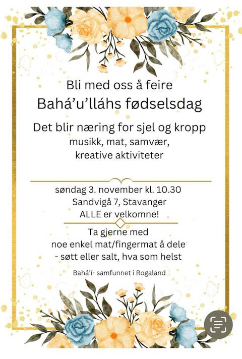 Bli med oss å feire Bahá’u’lláhs fødselsdag Det blir næring for sjel og kropp, musikk, mat, samvær og kreative aktiviteter ALLE er velkomne! Ta gjerne med noe enkel mat/fingermat å dele - søtt eller salt, hva som helst